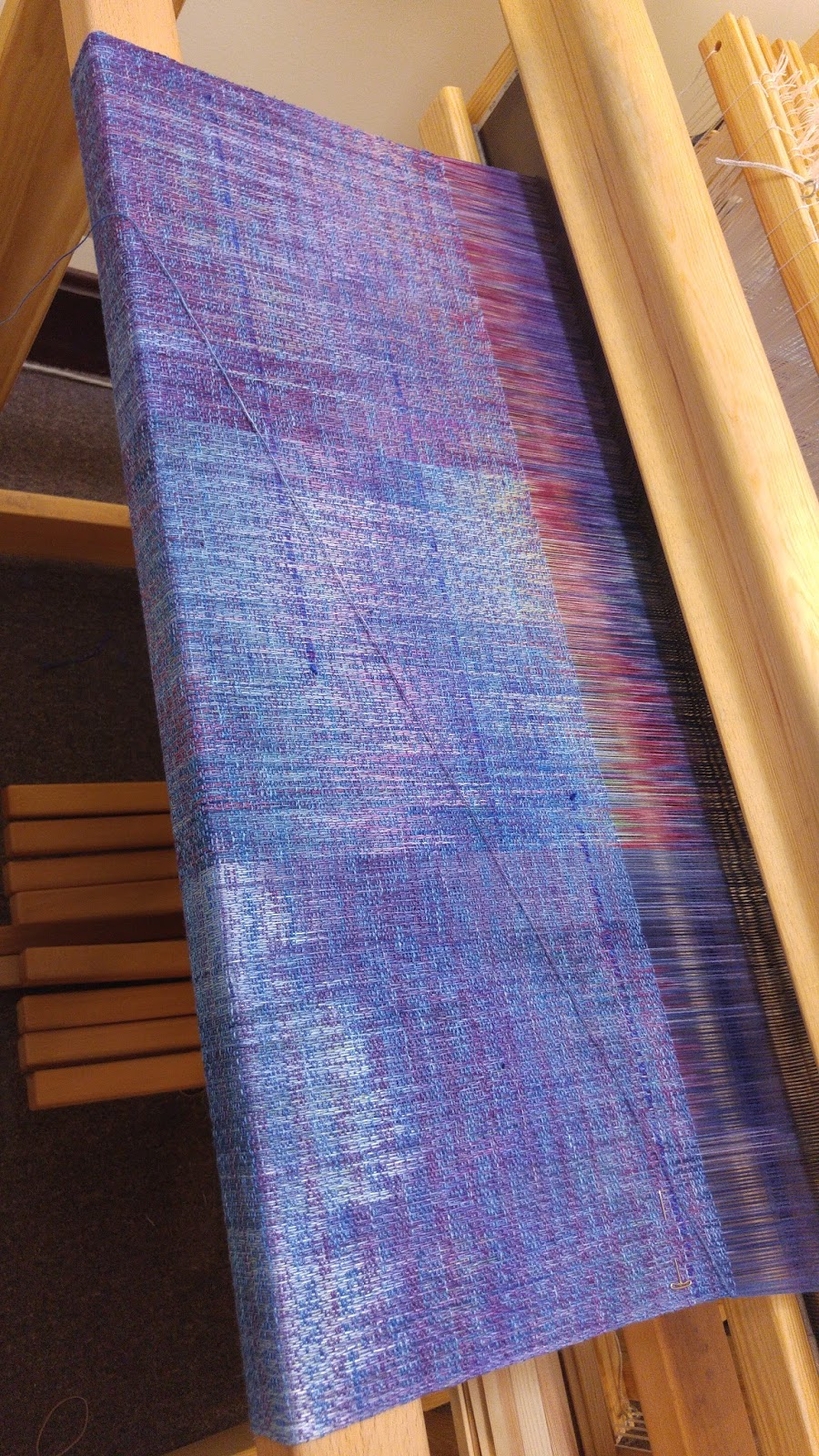 And so my chameleon warp became "Burning Up a Sun", an unintentional but fitting tribute. Ultimately it was the most interesting piece I'd woven to date. The structure was complex and a long treadle pattern. As you moved away, it became blue/purple dominant, but closer, the bursts of color emerged and almost had rainbow explosions where each painted supernova was. (See the bottom right corner of the collage compared to the outdoor pictures). And of course the blacklight reaction changed it further. The bourette was grippy, but soft. The rose was shiny but bouncy and lofty in an almost wool type of way. Paradoxical.